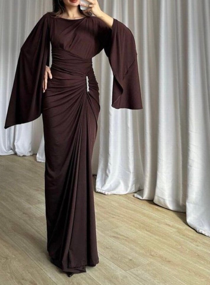 Kahverengi, drapeli ve uzun kollu, tek parça uzun abiye elbise. Bateau yaka ve vücuda oturan kesimi ile düğünler için uygundur.