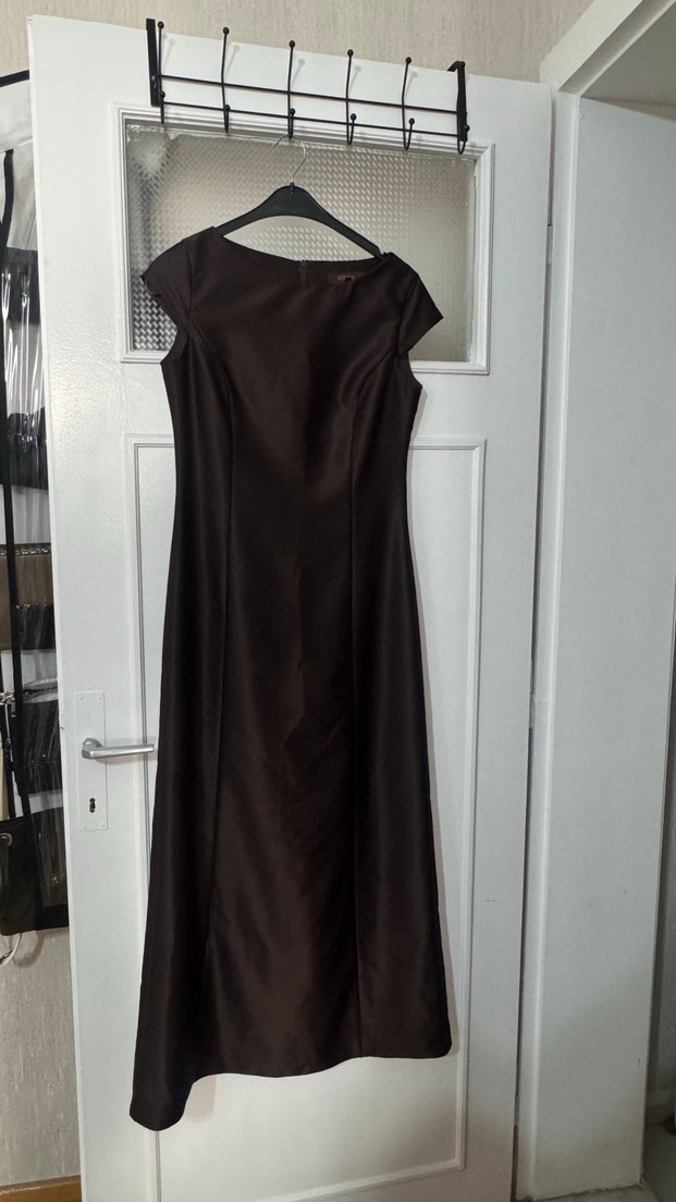 Kahverengi uzun abiye elbise, drapeli tasarım ve kayık yaka ile klasik şıklık sunar. Kolsuz ve vücuda oturan kesime sahiptir. Fermuar kısmında azıcık sökülme oldu