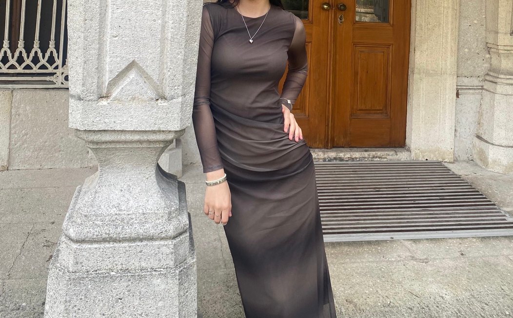 Kahverengi, uzun ve drapeli, ince kesim elbise. Tekne yaka ve uzun kollu, ipeksi kumaştan, minimalist ve goth tarzına uygun günlük kullanıma. Markası lefties. Bedeni s fakat bedeni m olan biri elbiseyi tam doldurabilir. Üstünde tül detayı içinde ise astarı var çok rahat şekilde kullanırsınız.