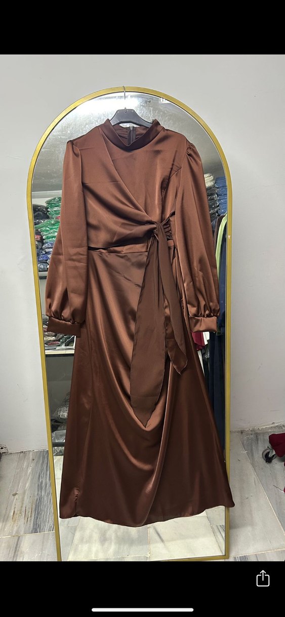 Kahverengi, uzun kollu, yüksek yakalı ve drapeli tasarıma sahip, ipeksi kumaştan yapılmış, düzenli kesim uzun elbise. Sıfır etiketli elbise