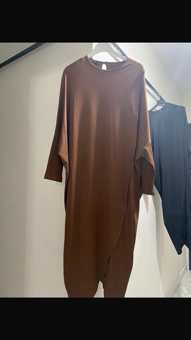 Kahverengi uzun elbise, drapeli tasarımı ve bol kesimiyle dikkat çeker. Uzun kollu, yuvarlak yakalı ve minimal tarzda, yumuşak sentetik kumaştan üretilmiştir. Günlük kullanım için uygundur.
