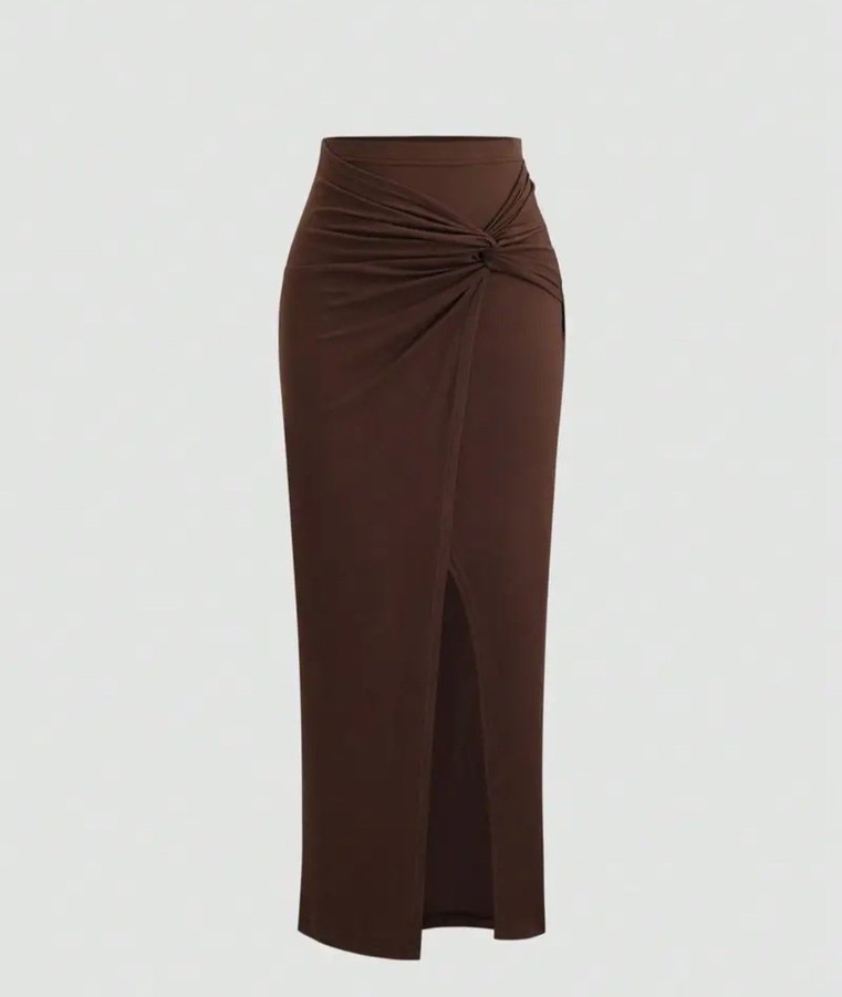 Kahverengi, ipeksi kumaştan, drapeli detay ve ön yırtmaçlı, ofis için uygun minimalist ve çağdaş kesimde uzun, dar kesim etek.