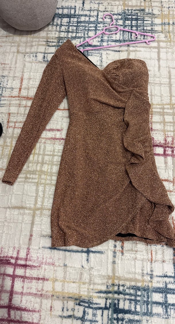 Koyu kahverengi, tek uzun kollu ve straplez yakalı, drapeli tasarıma sahip, vücuda oturan uzun abiye elbise. ✨