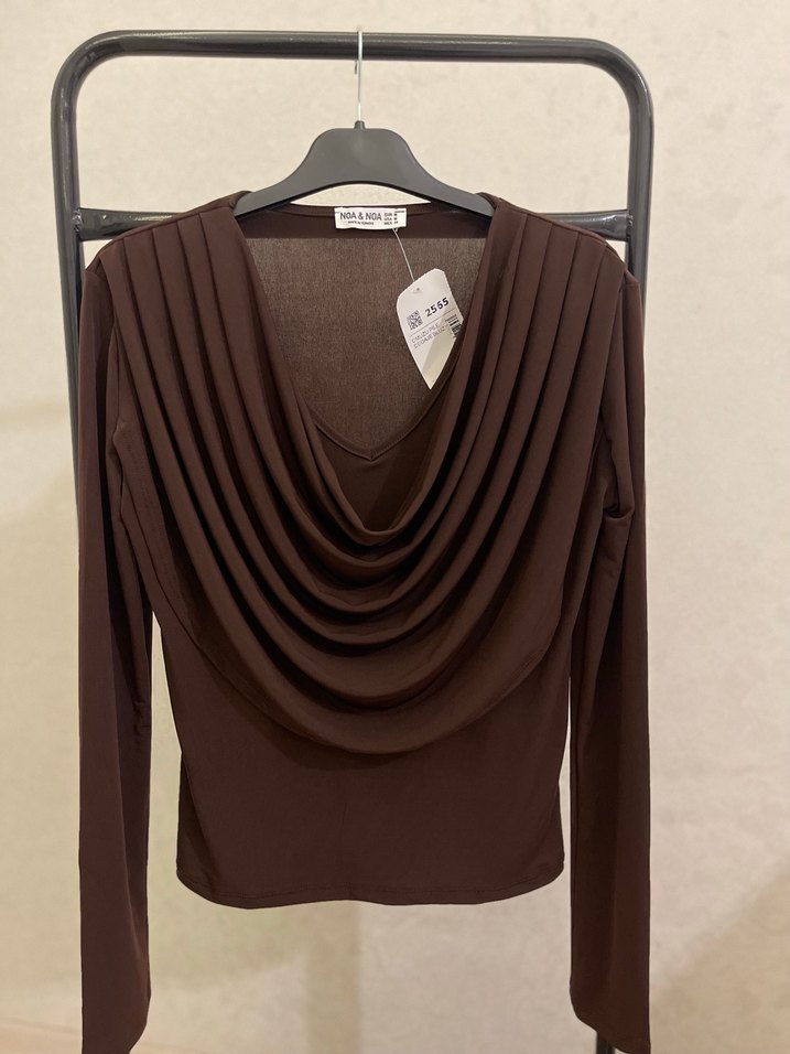 Kahverengi bluz, drapeli yakası ve uzun kolları ile yumuşak keten kumaştan üretilmiştir. Loose fit ve kısa boyda, modern bir tarz sunar. beden seçenekleri mevcut