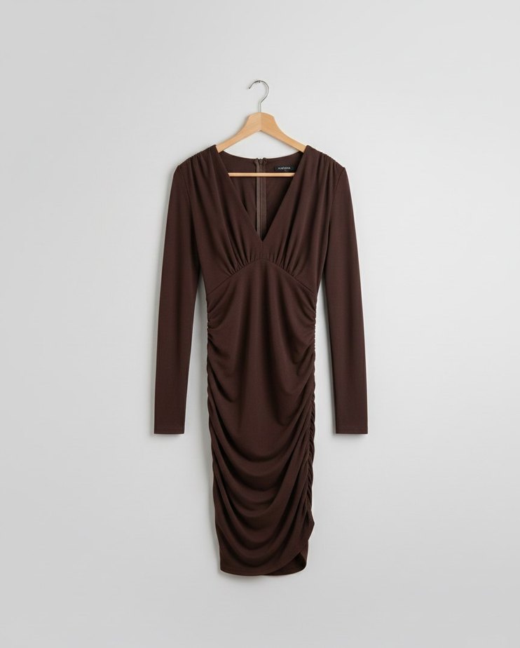 Kahverengi, drapeli ve V yakalı, uzun kollu, vücuda oturan uzun elbise. Minimalist ve klasik zarafet için uygundur.