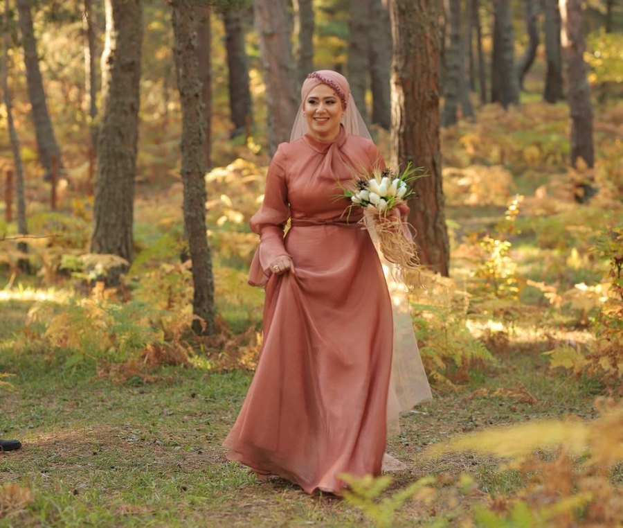Kahverengi, drapeli ve uzun kollu nişan elbisesi. Uzun boyu ve düğmeli yaka detaylarıyla modest ve parlak bohem tarzı sunar. Eşarp hediye