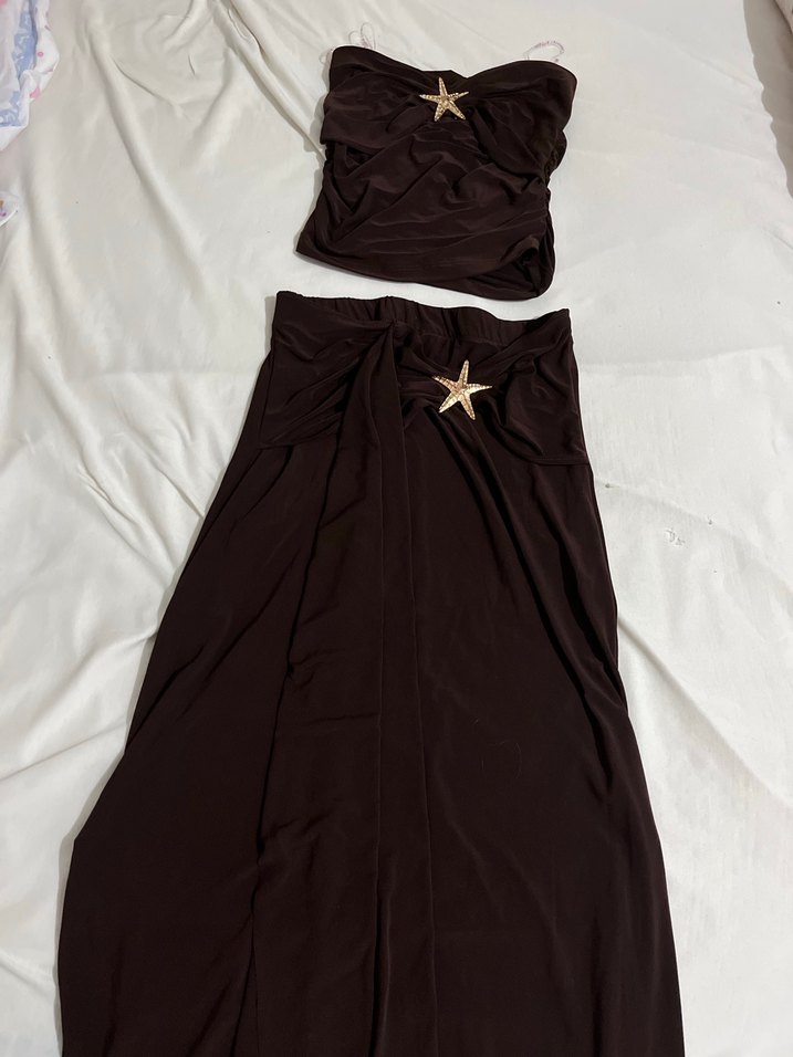 Kahverengi straplez, drapeli ve uzun etekli abiye elbise. Minimalist gotik tarzda, yıldız detaylı, fit kesim ve şık görünüme sahip.