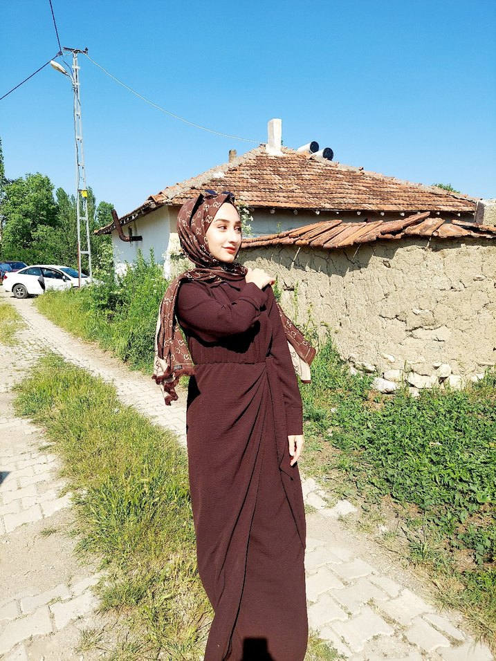 Kahverengi Drapeli Uzun Tesettür Elbise