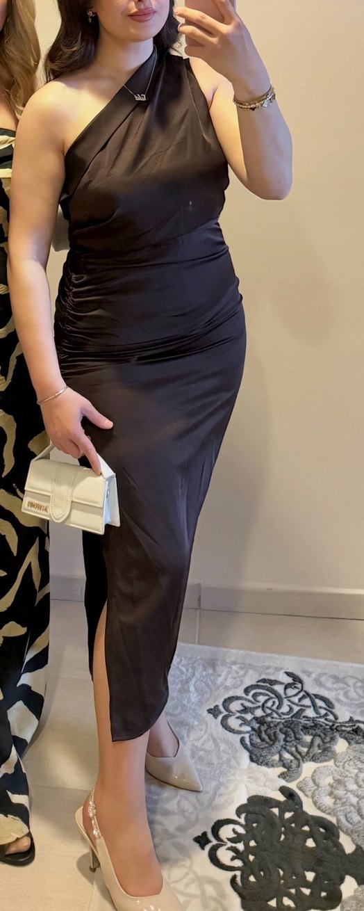 kahverengi drapeli yan yırtmaçlı saten elbise