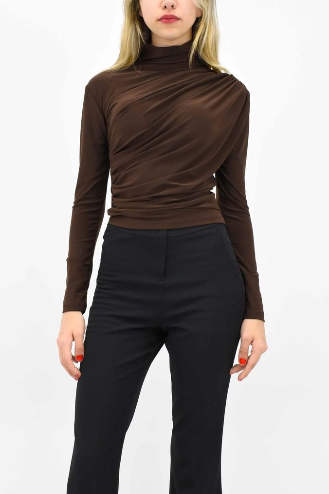 Kahverengi, yüksek yakalı ve uzun kollu, drapeli detaylı, ince oturan kadın bluz. Ofis ve iş ortamları için uygun, çağdaş tarzda, ipeksi dokuda.