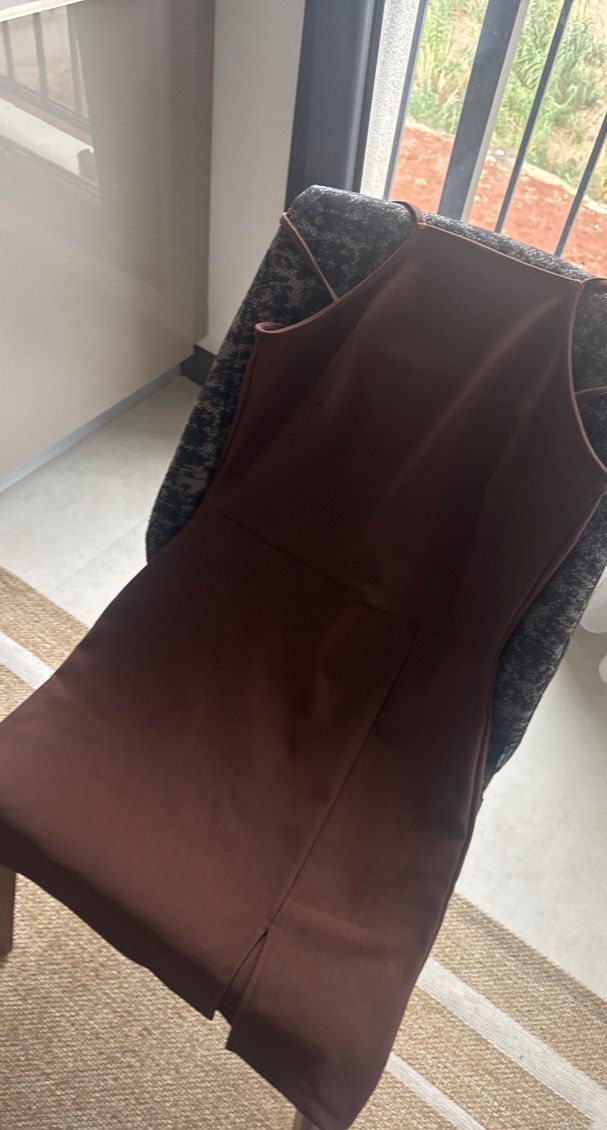 Kahverengi, drapeli ve yüksek yakalı bu uzun, dar kesim elbise, minimalist ve çağdaş ofis tarzına uygundur.