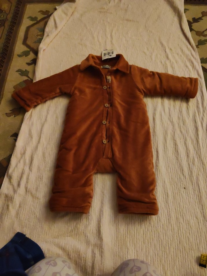 Koyu kahverengi, düğmeli, yumuşak ve sıcak kumaştan yapılmış bebek kış tulumu. Sokak tarzında sade tasarım.