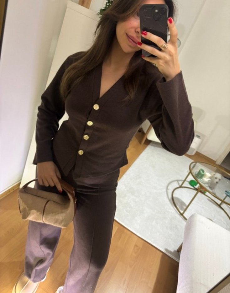 Kahverengi deri kadın takımı, V yakalı, uzun kollu ve düğmeli ön tasarımla ofis için uygun trend bir görünüm sunar.