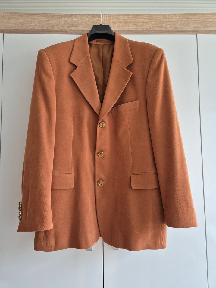 Kahverengi parlak renkte, düğmeli ve normal kesim erkek ceket. Uzun kollu, klasik yakalı ve ofis ile günlük kullanıma uygundur.
