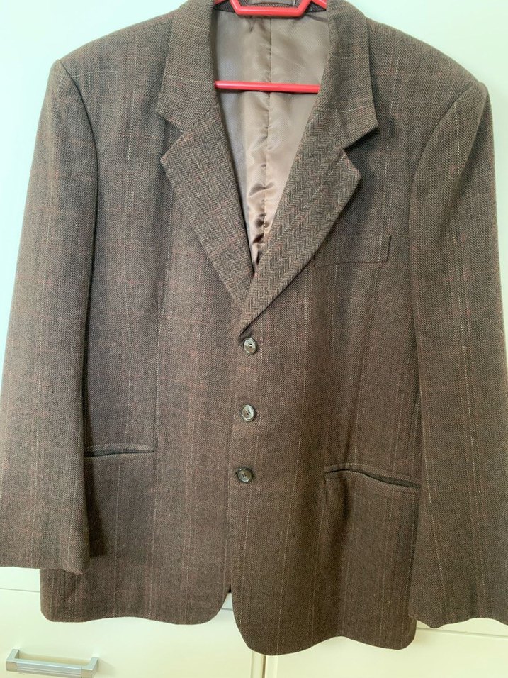 Kahverengi yün kumaştan yapılmış, düğmeli, normal kesim ve midi boyda erkek ceket. Uzun kollu ve ofis kullanımı için uygundur. terzi dikimi