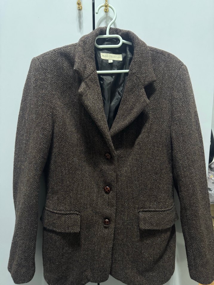 Kahverengi, yün kumaştan yapılmış, düğmeli, uzun kollu, klasik yaka kadın blazer ceket. Ofis kullanımı için uygun, normal midi boyda ve regular fit.