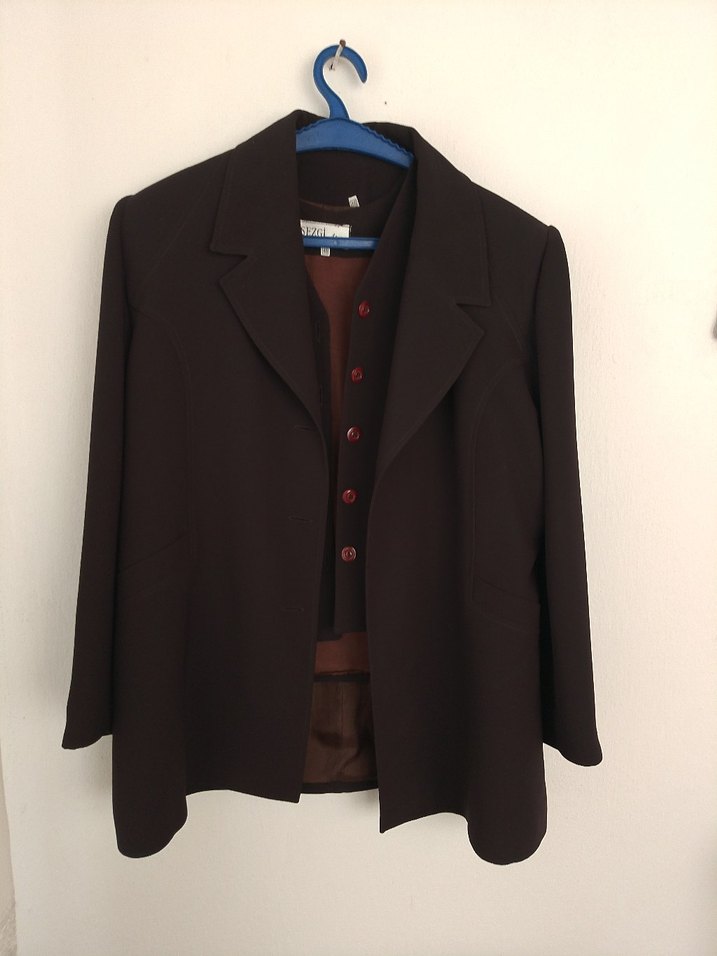 Kahverengi, düğmeli, uzun kollu kadın blazer ceket. Normal kesim ve ipeksi dokusuyla ofis kullanımı için uygundur.