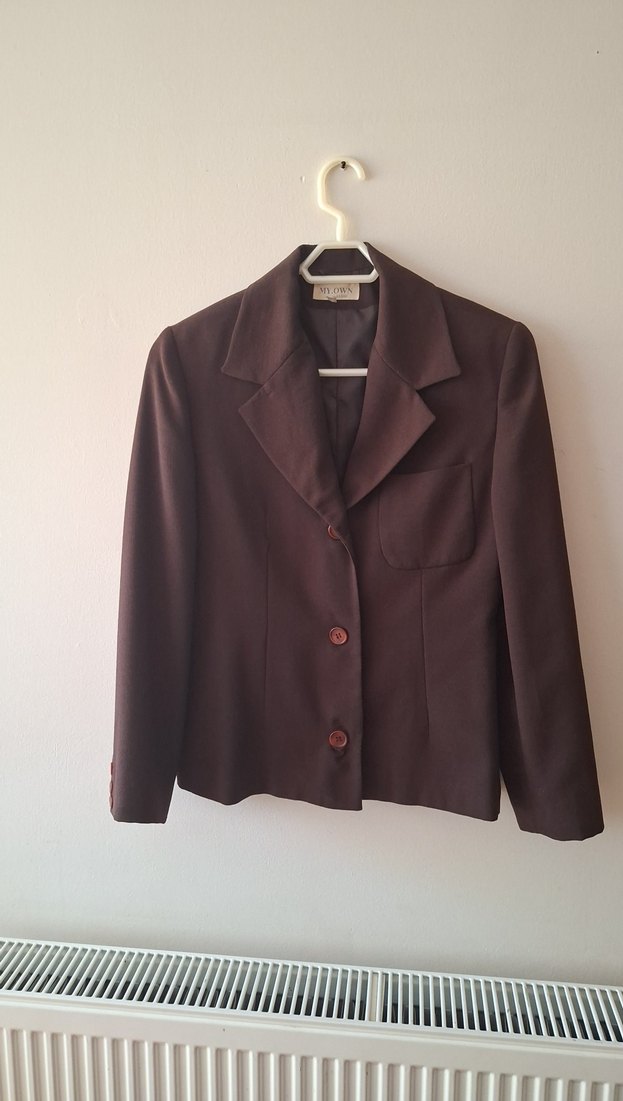 Düğmeli, kahverengi kadın blazer ceket, notched yaka ve uzun kolludur. Normal uzunlukta, regular fit olup ofis için uygundur. Yumuşak ve ipeksi dokudadır.