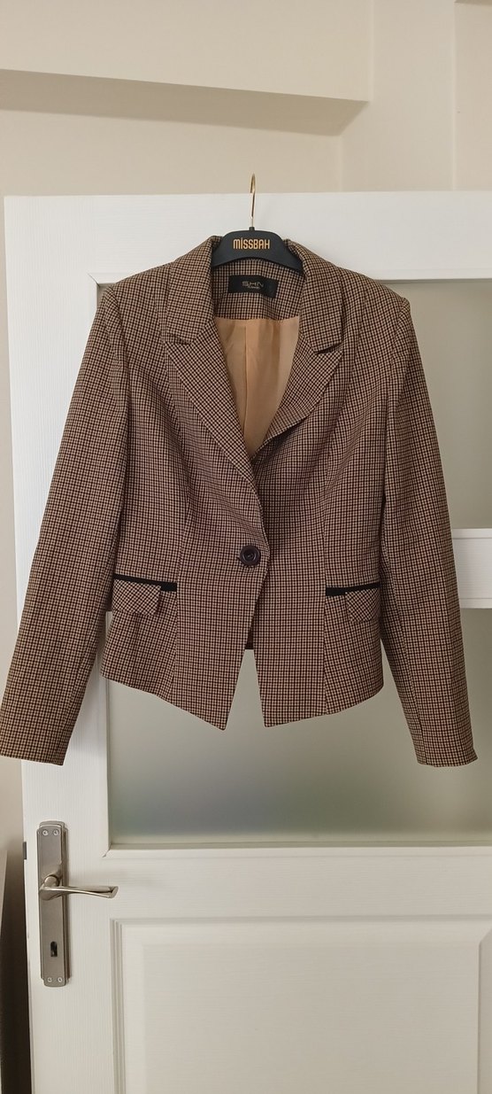 Kahverengi, düğmeli, uzun kollu ceket. Notlu yaka ve normal kesimle ofis kullanımı için uygun, midi boyda , kumaşı çok rahat. Etiketi yok ama hiç giyilmedi.