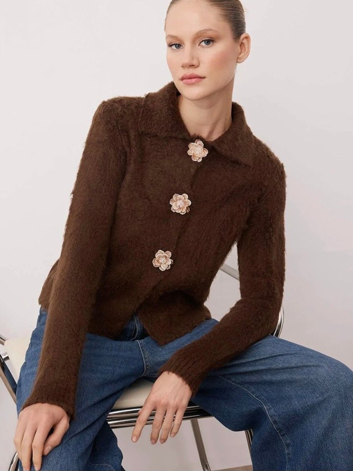 Kahverengi, çiçek şeklinde düğmeli, yakalı ve uzun kollu örme kadın hırka. Orta boy ve günlük kullanım için uygundur.