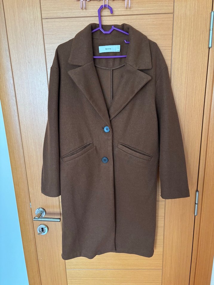 Kahverengi, klasik yakalı kadın kabanı, iki düğmeli ve iki cep detayına sahiptir. Yumuşak ve sıcak dokuludur.