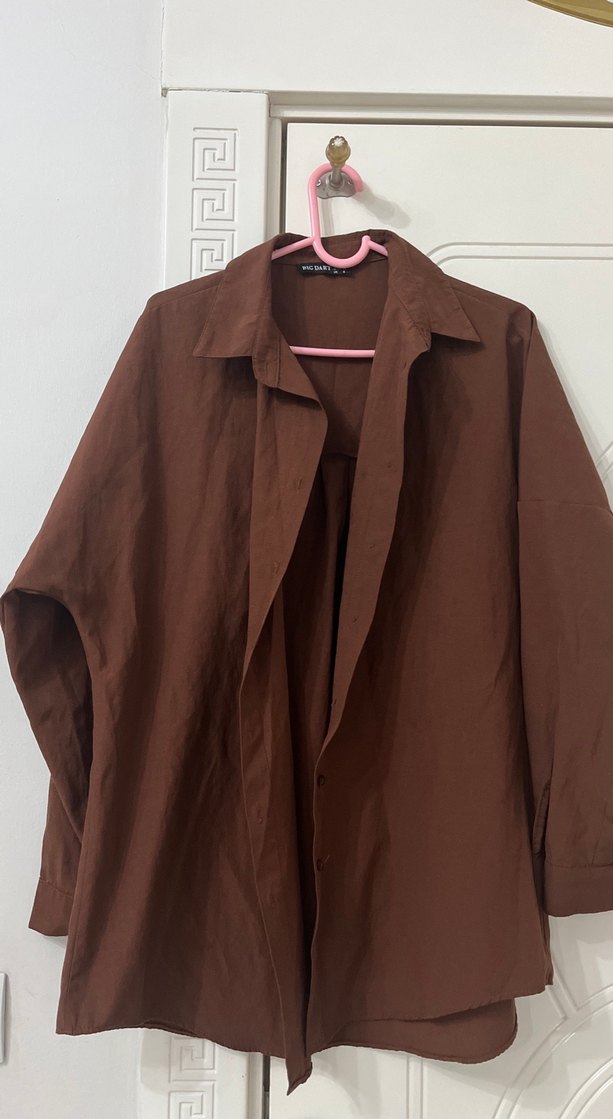 Düğmeli, kahverengi keten gömlek, notched lapel yakalı ve uzun kollu, bol kesim. Günlük sokak stili için uygun.