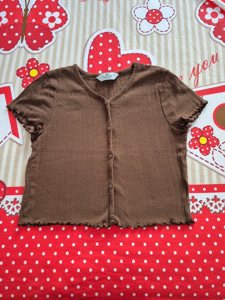 Kahverengi, düğmeli, kısa kollu, bisiklet yaka, fit kesim kız bluzudur. Bohem ve retro tarzda sokak giyimine uygundur. h&m marka 14 yaş için XS ve s bedenleri olur kahverengi krop Pamuklu ölçüler görselde gösterilmiştir Lekesiz sorunsuz temiz ürün öndeki düğme detayları açılmıyor aralarında boşluk yok aynı ürünün krem rengi de Dolabımda mevcut