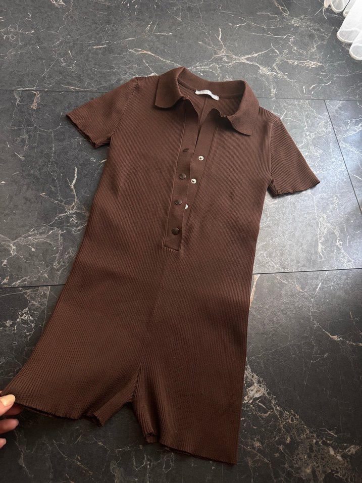 Kahverengi, düğmeli, kısa kollu, yakalı, midi boy, triko kumaştan, dar kesim kadın tulumu.
