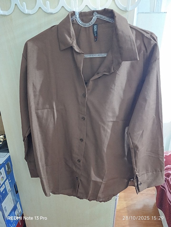 Kahverengi keten gömlek, düğmeli ön ve uzun kollu tasarıma sahiptir. Notlu yaka ve rahat kesimiyle günlük sokak stiline uygundur.