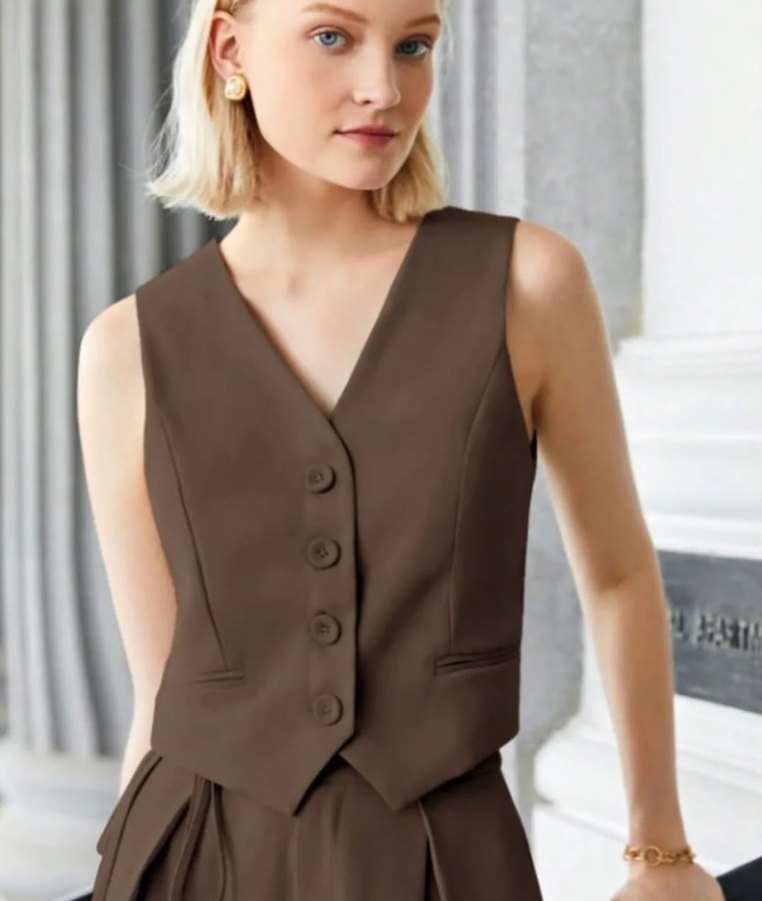 Kahverengi, düğmeli, V yaka, kolsuz kadın yelek. Kısa boy ve regular fit yapıda, pürüzsüz sentetik kumaştan üretilmiştir. Ofis kullanımı için uygundur.