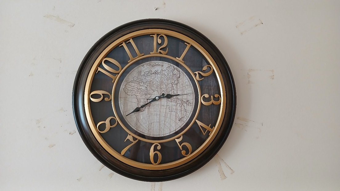 Koyu kahverengi duvar saati, büyük altın renkli rakamlar ve vintage dünya haritası detaylarıyla klasik bir görünüm sunar. ️