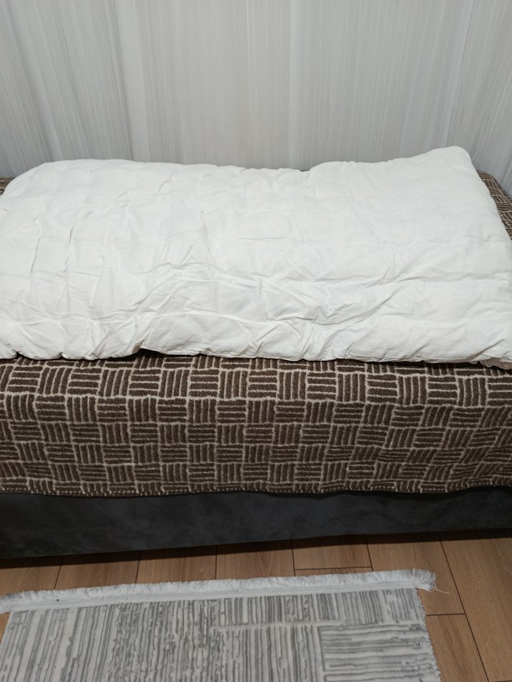 Kahverengi ve gri tonlarında, düz desensiz, dokulu görünüme sahip yatak örtüsü. Yatağı düzgünce kaplar. ️