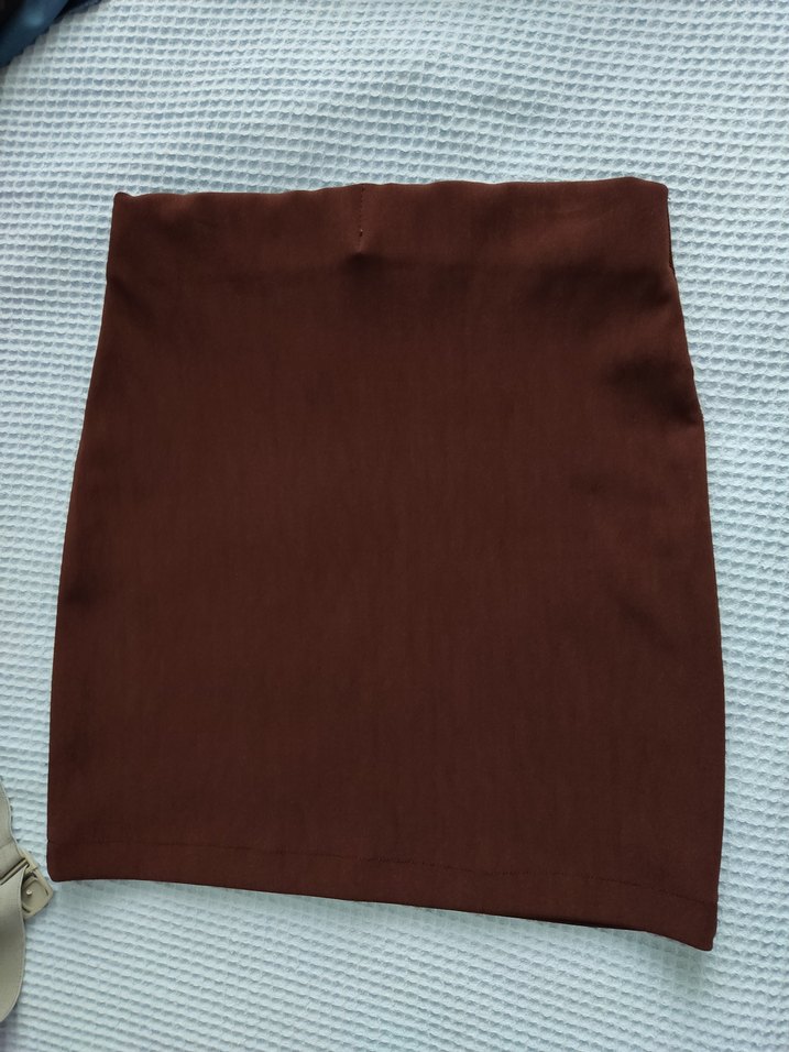 Düz kahverengi, sentetik kumaştan yapılmış, vücuda oturan kadın mini eteği. Günlük sokak stili için sade ve şık. M-L beden uyumlu. Temiz kullanıldı. Beli lastikli/likralı