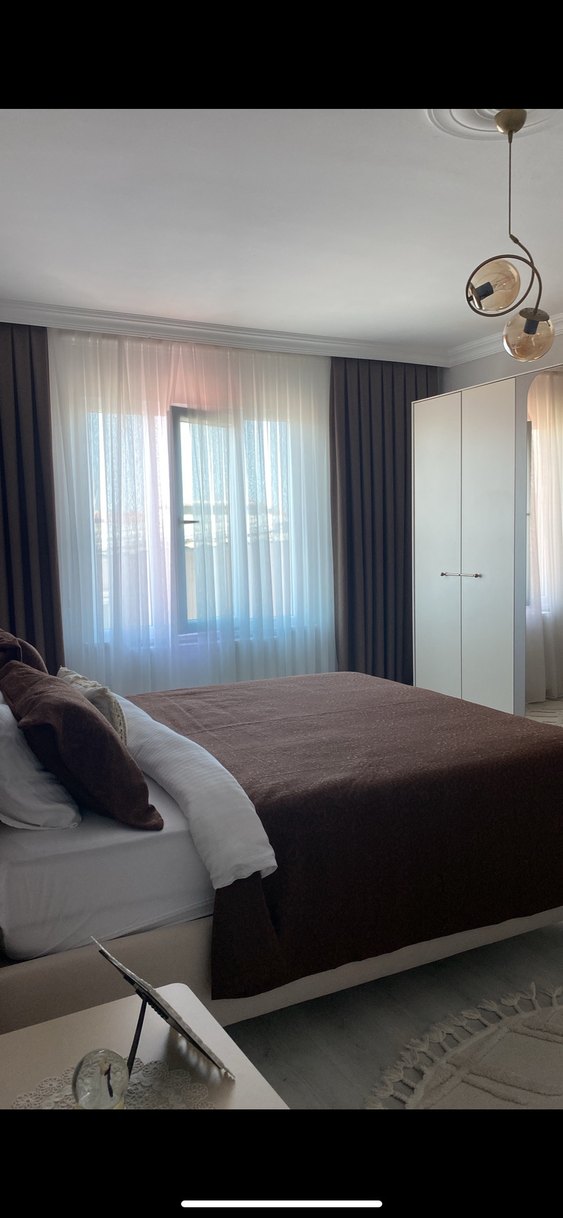 Düz, desensiz ve koyu kahverengi yatak örtüsü, yatağı düzenli şekilde kaplayarak sıcak bir yatak odası görünümü sağlar. ️