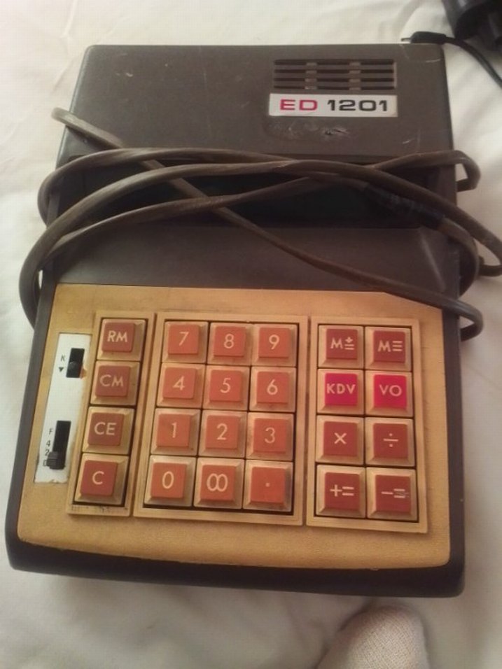 Sayısal ve fonksiyon tuşlarına sahip, kablolu koyu kahverengi ED1201 hesap makinesi. Kullanım izleri görülmektedir.