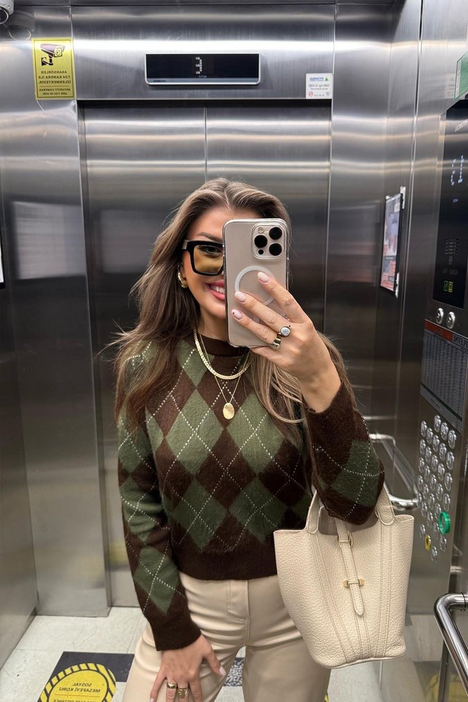 Kahverengi ve yeşil ekose desenli, bol kesim, uzun kollu, bisiklet yaka örgü kadın kazak. Günlük sokak stiline uygun.