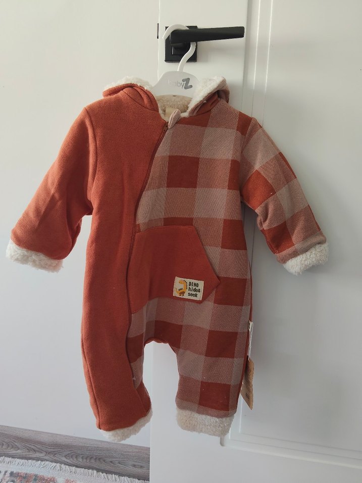 Kahverengi ekose desenli, örme tasarımlı ve yumuşak polar astarlı erkek bebek tulumu 9-12 ay 74 cm Kalın içi welsoft fermuarlı tulum