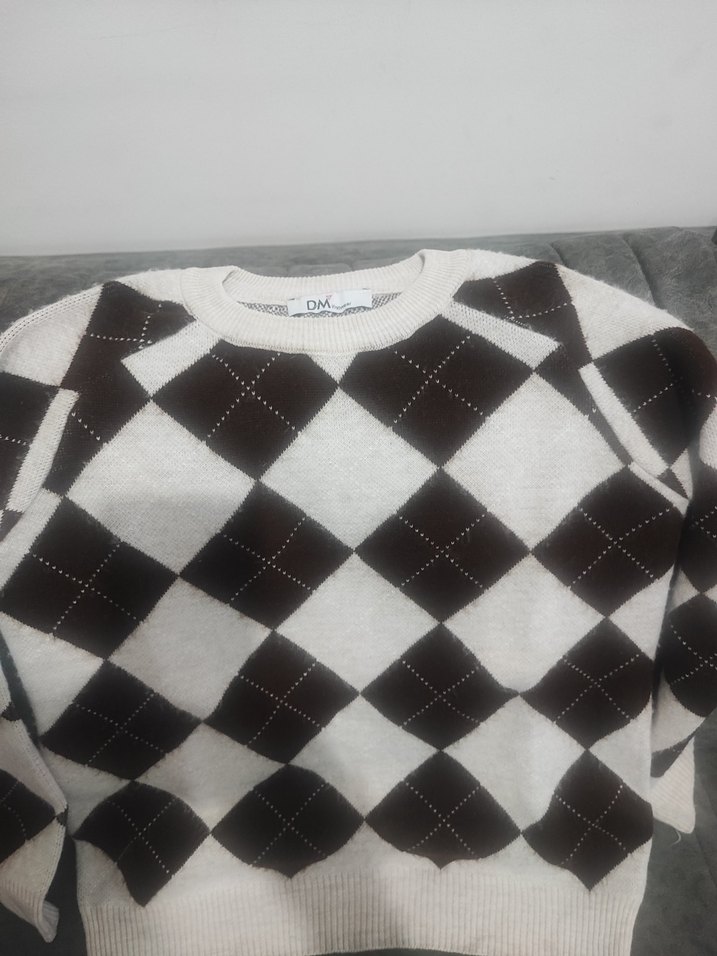 Kadınlar için kahverengi ve krem tonlarda ekose desenli, yuvarlak yaka, uzun kollu, rahat kesim triko kazak. Günlük kullanıma uygun, konforlu ve şık.