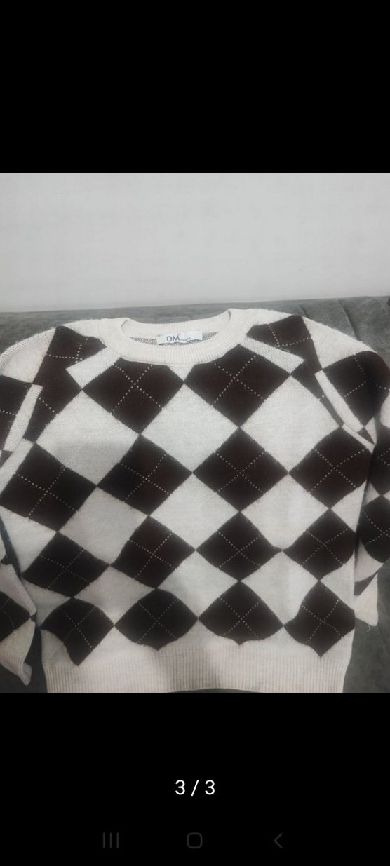 Kahverengi ekose desenli, uzun kollu, yuvarlak yaka triko kazak. Rahat kesim ve normal boyda, günlük sokak tarzına uygun.
