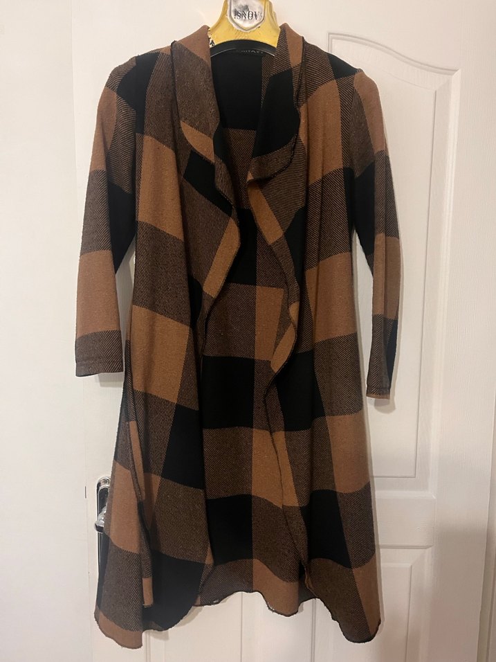 Bu uzun kahverengi yün kaban, bol kesim, uzun kollu ve drapeli, çentikli yaka ile tasarlanmıştır. Koyu ekose deseni, günlük kullanıma uygun rahat bir sokak stili sunar.