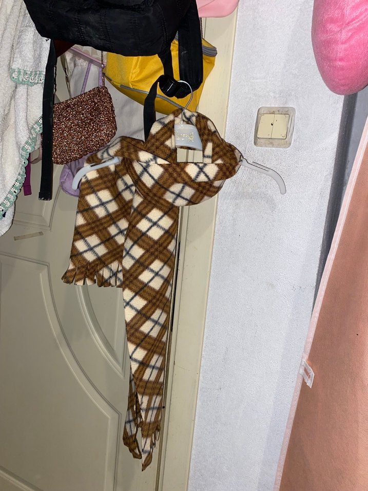 Kahverengi, koyu ekose desenli yün atkı, rahat bohem tarzıyla drapeli tasarım sunar. Retro ve hippie görünüm için uygundur.