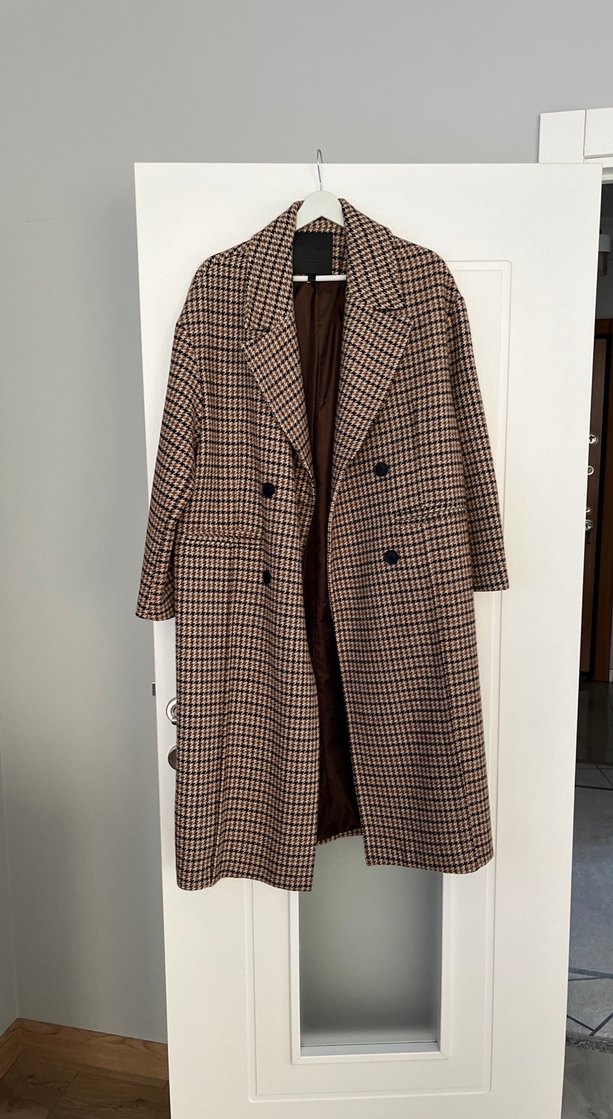 Kahverengi ekose desenli yün kaban, düğmeli önü, notched yakası ve midi boy uzun kollarıyla günlük sokak stiline uygun rahat kesim sağlar.