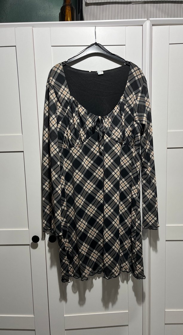 Kahverengi ekose desenli midi elbise, uzun kollu ve V yaka, drapeli ve bol kesimdir. Paris tarzında günlük kullanıma uygundur.