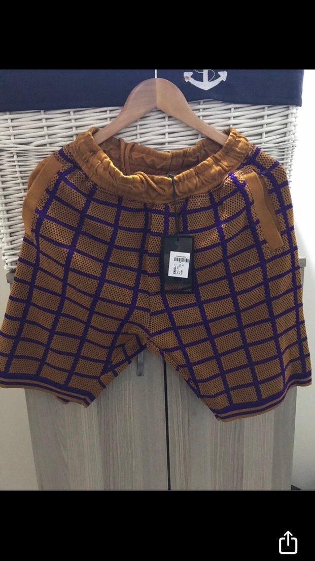 Kahverengi örgü kumaştan, ekose desenli, bol kesim erkek şort. Sokak modası ve athleisure tarzını yansıtır.