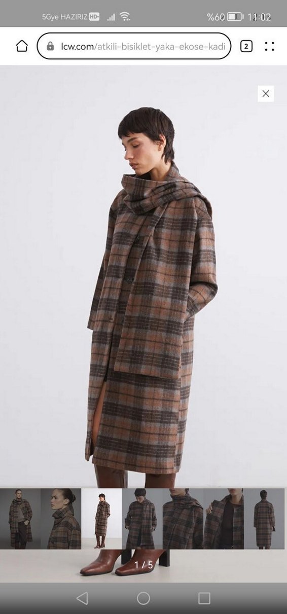Kahverengi ekose desenli uzun kaban, kendinden atkılı istenirse ayrı ayrıda kullanılabilir. Düz kesim ve yan ceplere sahiptir.