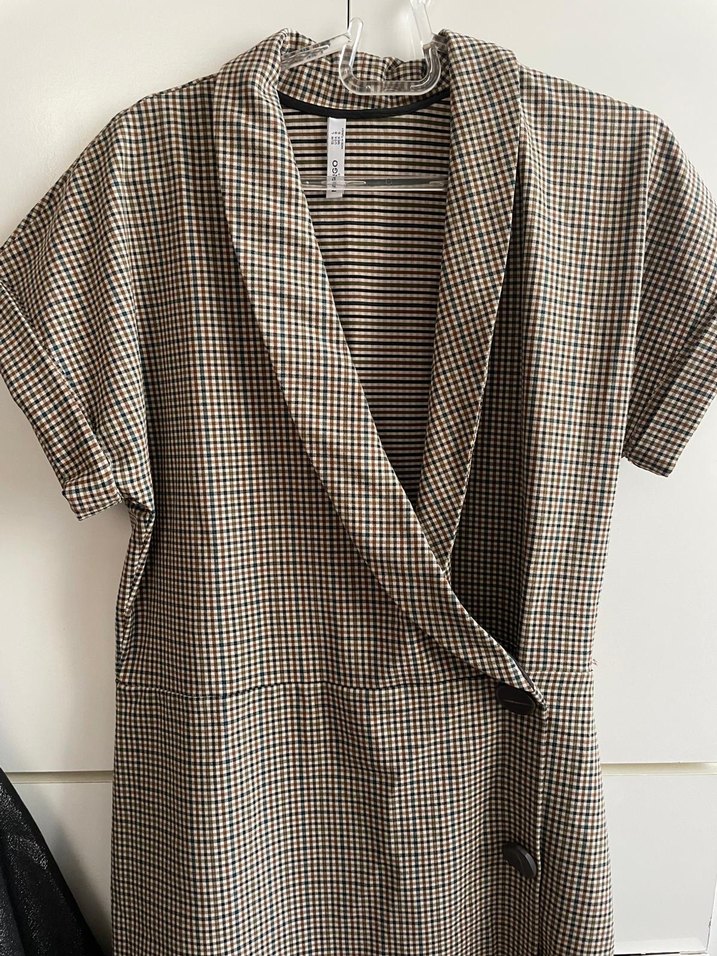 Kahverengi ekose desenli, uzun kesim ve strappy kollara sahip kadın elbisesi. Paris sokak modasından esinlenmiştir. Rahat ve şık bir görünüme sahiptir.