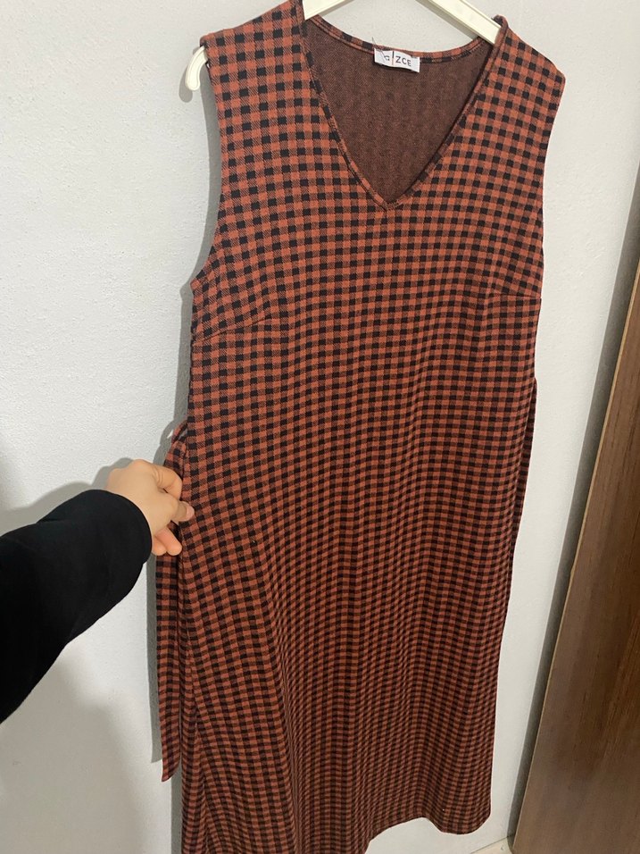 Kahverengi ekose desenli uzun kolsuz elbise, V yaka ve bol kesimlidir. Sentetik kumaştan yapılmış, pilili detaylara sahiptir, günlük kullanım için uygundur.