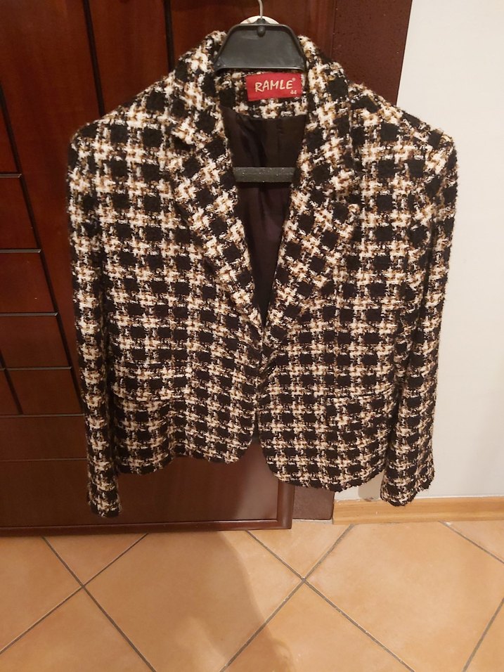 Kahverengi ekose desenli kadın blazer, kısa ve regular kesimdir. Düğmeli, uzun kollu ve notched yaka detayına sahiptir. RAML markalı, ofis için uygundur.