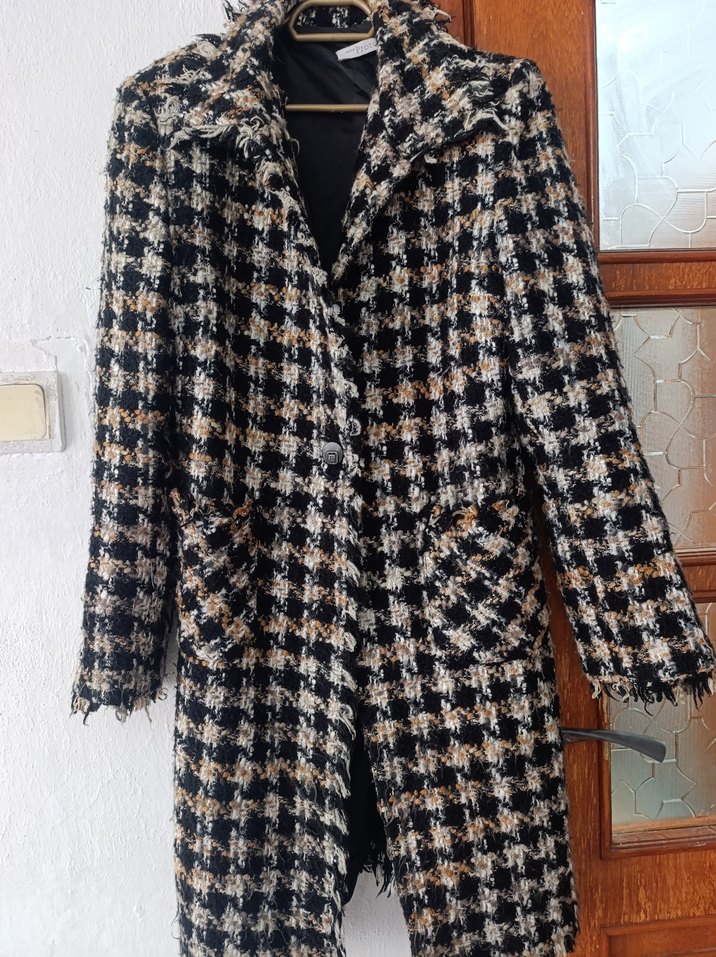 Kahverengi ekose desenli, düğmeli uzun kadın kaban. Notlu yaka ve uzun kollu, sentetik kumaştan, günlük sokak stili için uygun.