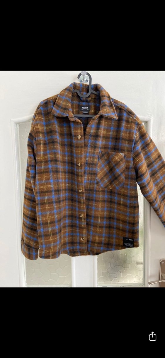 Düğmeli, uzun kollu, kahverengi ekose desenli yumuşak kumaştan, bol kesim erkek gömlek. Günlük kullanıma uygundur. Kalın ve sıcak tutar